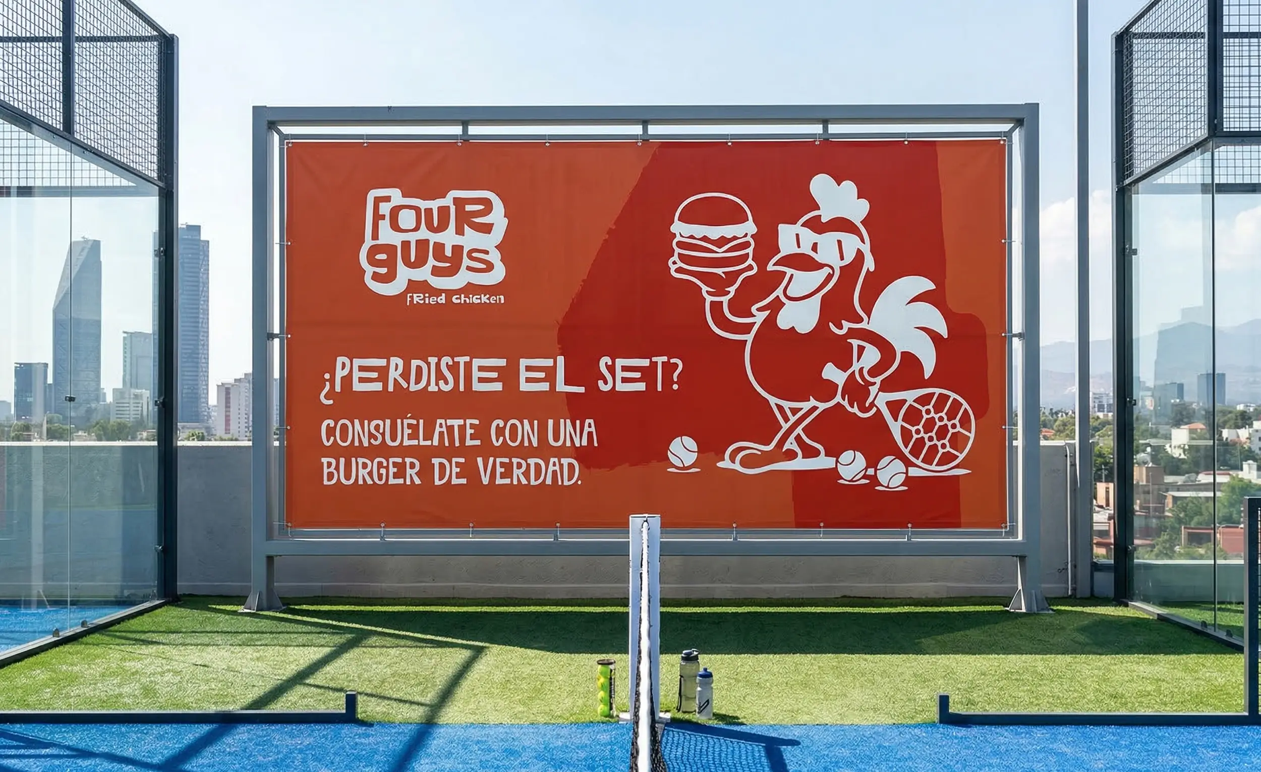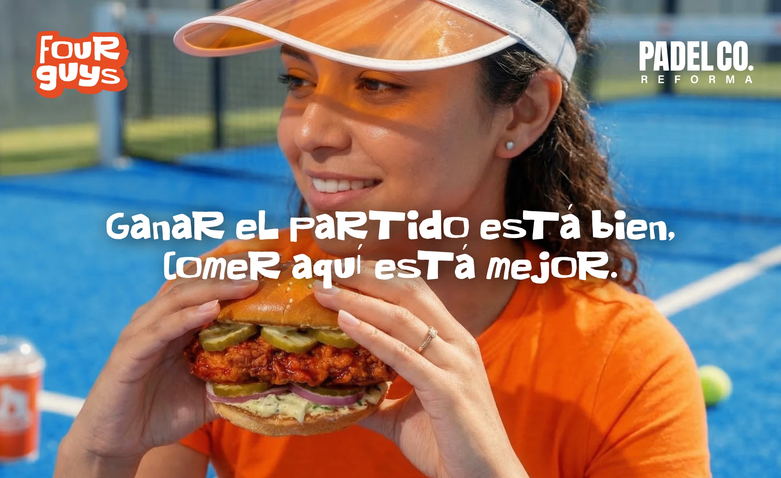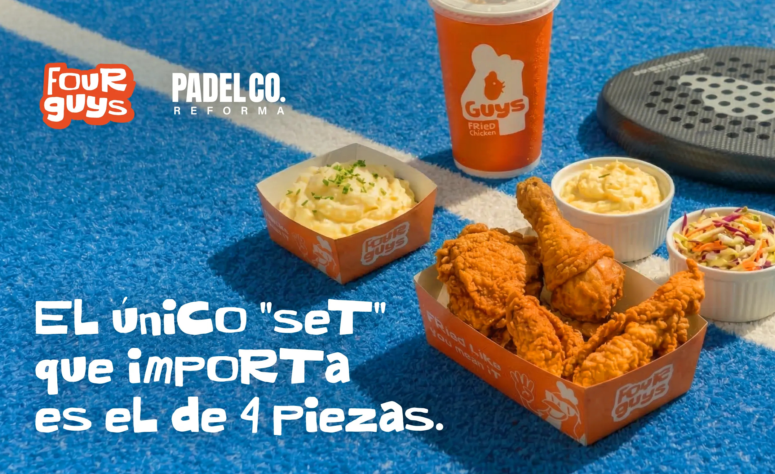 Desarrollamos el branding integral para 4 Guys, un fast food de pollo frito y hamburguesas en Padel Co Reforma, abarcando logotipo, identidad visual, mascota, empaques, menús y contenido estratégico. El resultado es una marca agresiva, completamente funcional y diseñada directamente para dominar las ventas dentro del complejo.