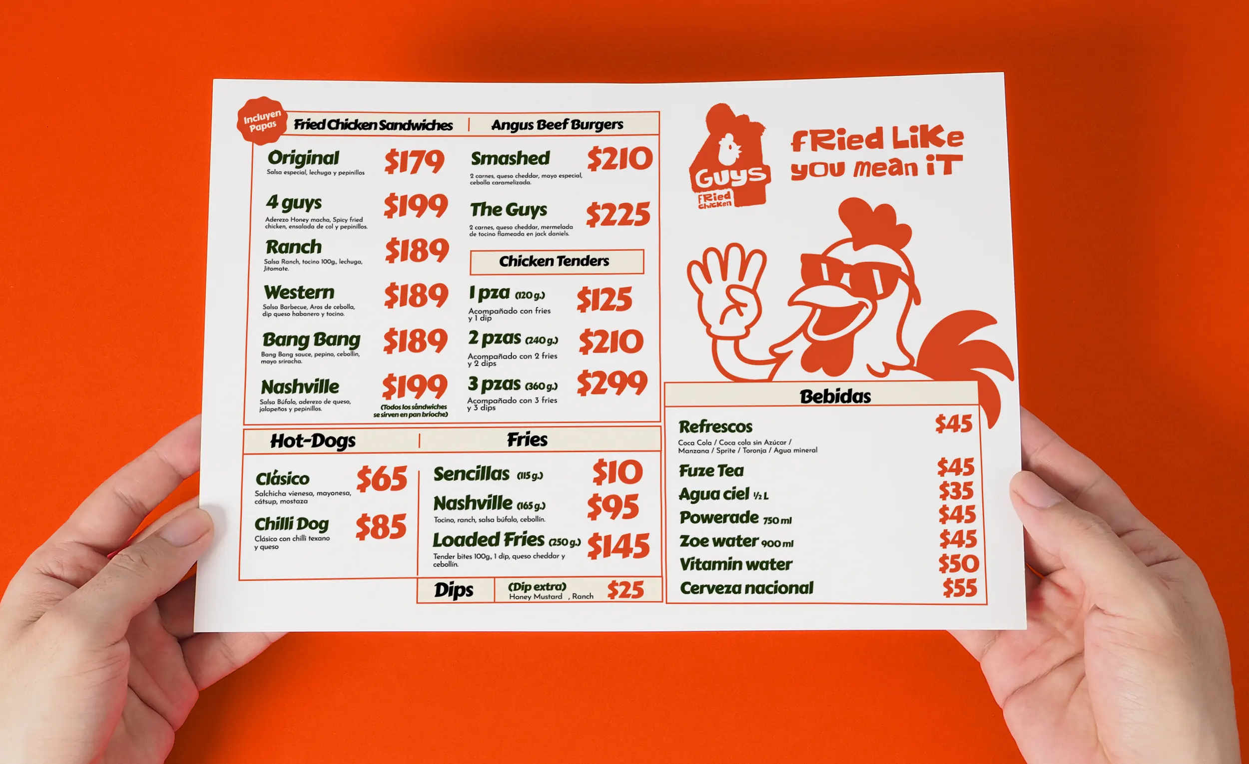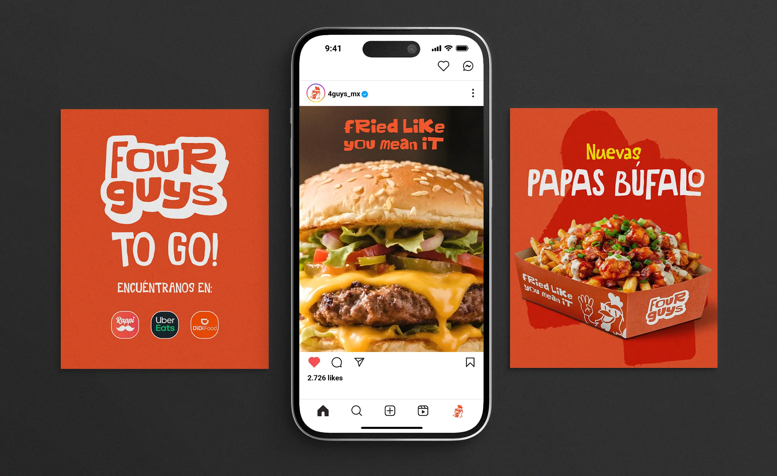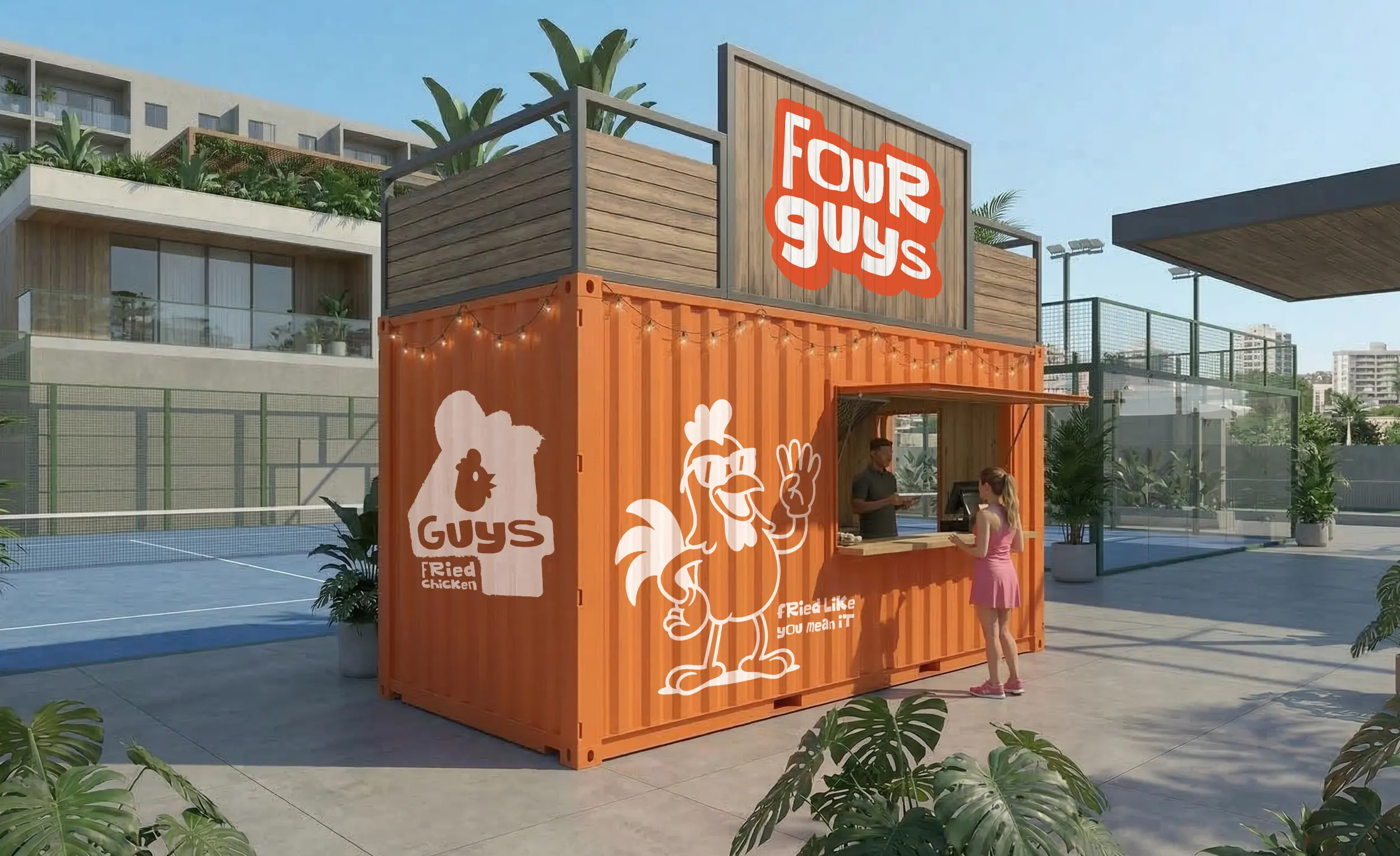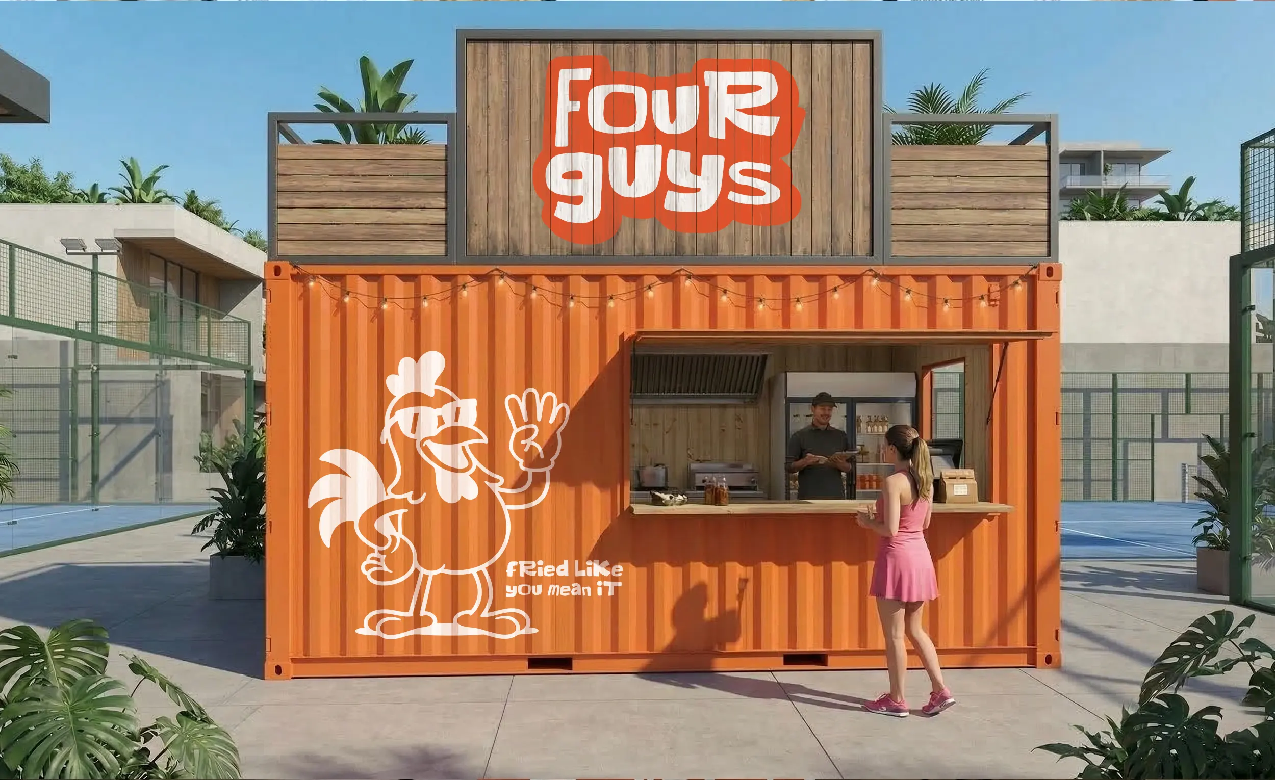 Desarrollamos el branding integral para 4 Guys, un fast food de pollo frito y hamburguesas en Padel Co Reforma, abarcando logotipo, identidad visual, mascota, empaques, menús y contenido estratégico. El resultado es una marca agresiva, completamente funcional y diseñada directamente para dominar las ventas dentro del complejo.